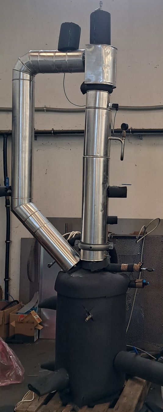 The operating principle of the high-temperature heat pump based, ejector-driven, water purification/vacuum distillation equipment is based on the recovery of the condensation (latent) heat of the evaporating steam (vapor re-compression). The main parts of the equipment: (1) water-driven ejector, (2) heat exchanger, (3) evaporation tank, (4) motive pump (5) operation fluid tank. By starting the pump, the ejector reaches its operation condition. The ejector creates vacuum at the suction end and atmospheric or higher than atmospheric pressure at the discharge end of it. The suction nozzle of the ejector is connected to the evaporator, creating a vacuum in it. As a re-sult of the vacuum in the evaporator, the water begins to boil, the formation of steam begins, which is sucked out by the ejector from the evaporator. The extracted steam meets and mixes with the motive fluid and condenses after being transferred to the atmospheric/super-atmospheric pressure area (operation liquid tank). The released condensation heat is transferred by the heat exchanger to the water in the evaporating tank, due to which the steam formation becomes more intense and the temperature starts to rise. The heart of the device is the high-performance liquid-driven ejector, which can simultaneously create a strong vacuum, extract a sufficient amount of steam and atmospheric pressure or more on the outlet side. The equipment can be used for cleaning sewage, raising the temperature of thermal waters (high temperature heat pump), producing drinking water from seawater, any other vacuum distillation task, concentration for food industry, in an energy-efficient way. The only energy introduced to the system is the electrical energy of the motive pump. Depending on the design of the equipment, 20-75kW of electrical energy is required to produce 1m3 of distilled water. The efficiency of the equipment largely depends on the design of the evaporator and the efficiency of the motive pump.